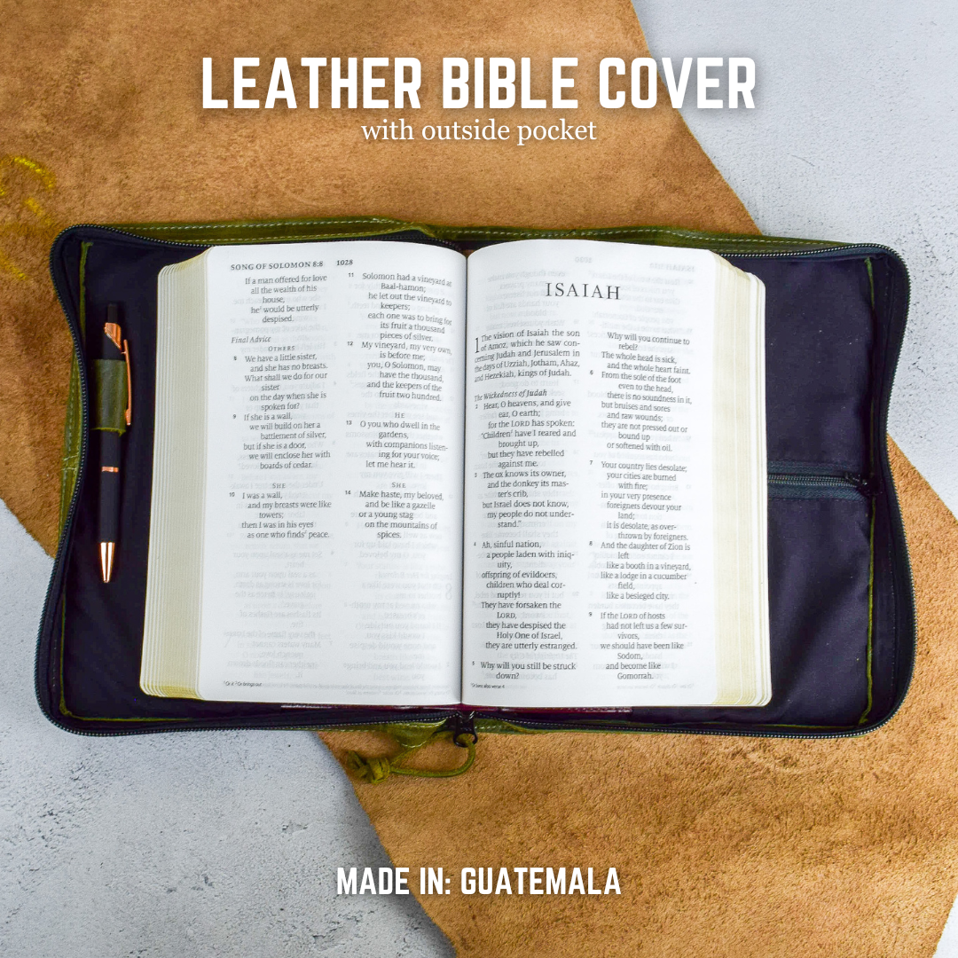 I love this full-grain leather Bible cover. It's handcrafted by women artisans in Guatemala...it's not just a great product but also supports a meaningful cause.Quality and CraftsmanshipThe full-grain cow leather feels fantastic—it's sturdy yet flexible. You can see the natural grain and unique markings, which give it a cool, authentic look. The stitching is strong and precise, showing the skill and care that went into making it. And it smells just like real leather should smell like!Design and FunctionalityThe design is both stylish and practical. It fits my Bible perfectly, providing excellent protection. The interior pockets are a nice touch, handy for keeping notes, Bible study book, and a pen. It's clear a lot of thought went into making this cover useful as well as good-looking.Social ImpactThis isn't something mass produced in China. What makes this Bible cover special is knowing it’s made by women artisans in Guatemala who are being empowered through their work. Buying this cover helps support their livelihoods and skills development, and provides them with income to put beans on their table and send their children to school which feels great.Summary Thoughts...Overall, this full-grain leather Bible cover is a fantastic purchase. It’s high-quality and supports a great cause. If you’re looking for a durable, well-made Bible cover that also makes a positive impact, I highly recommend this one.