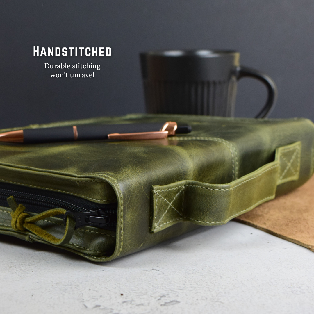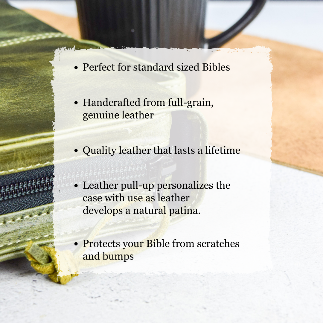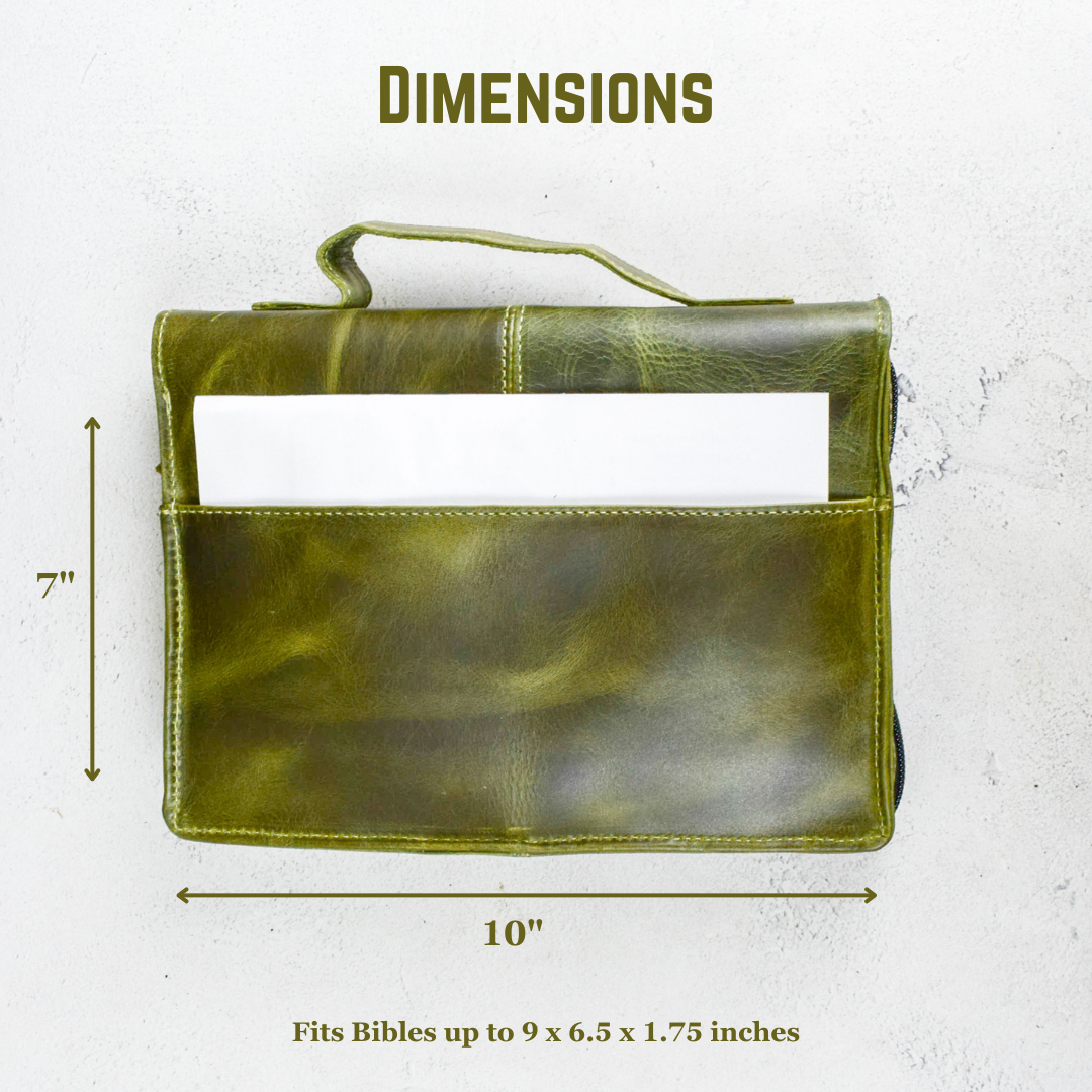 Dark Green Full Grain, Natural Leather Bible Cover / Case with Zipper