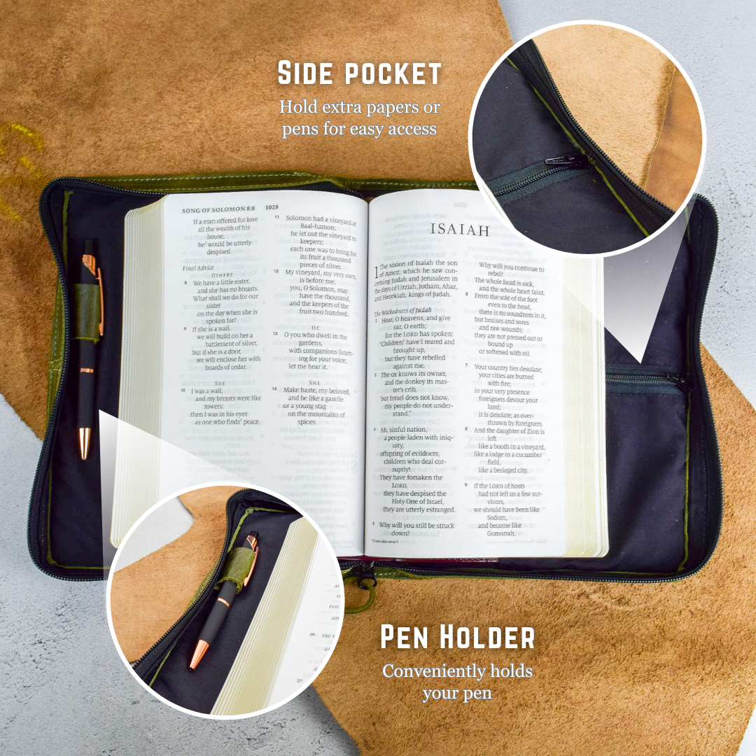- Stylish Dark Green Leather: Because who said Bible covers have to be bland? This unique color makes for a great conversation starter.