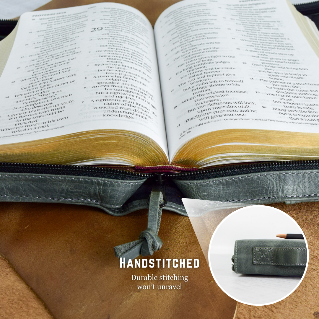 Gray Full Grain, Natural Leather Bible Cover / Case with Zipper