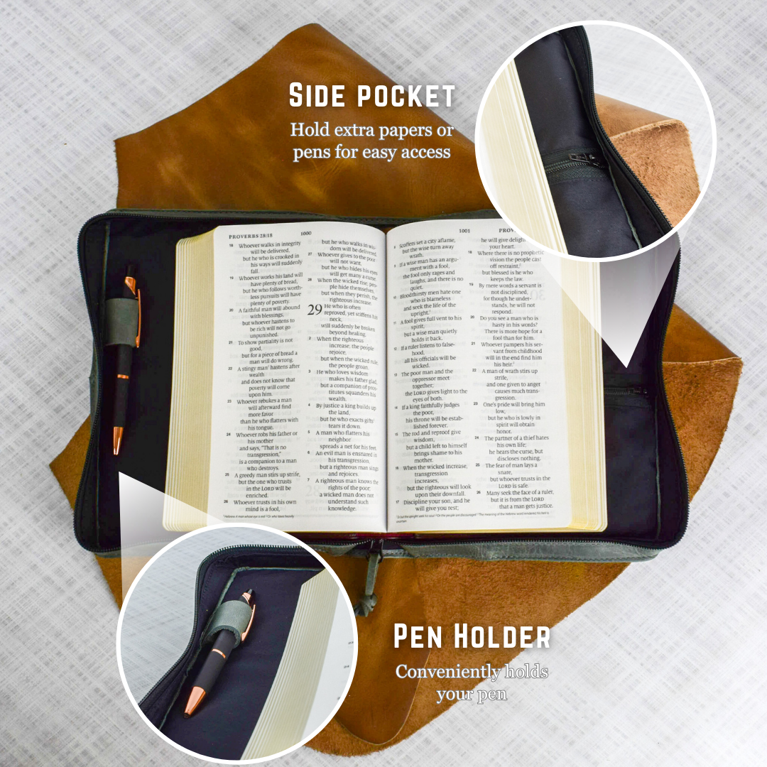 - The exterior of the Bible cover boasts a zipper to keep your copy of the scriptures in pristine condition during transport.