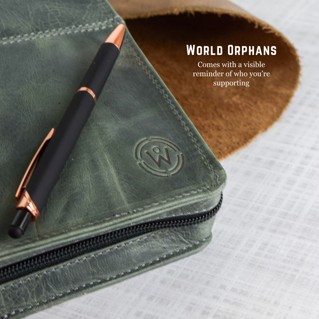 As you feel the buttery soft leather, rest in the thought that your purchase provided at-risk children stability. Each piece of leather work purchased from World Orphans is hand crafted by mothers and fathers whose children would otherwise be at risk of homelessness. These highly skilled artisans are provided economic stability as well as integral life-skills training through YOUR purchase. We encourage you to praise God for the artisan each time you open your Bible case.