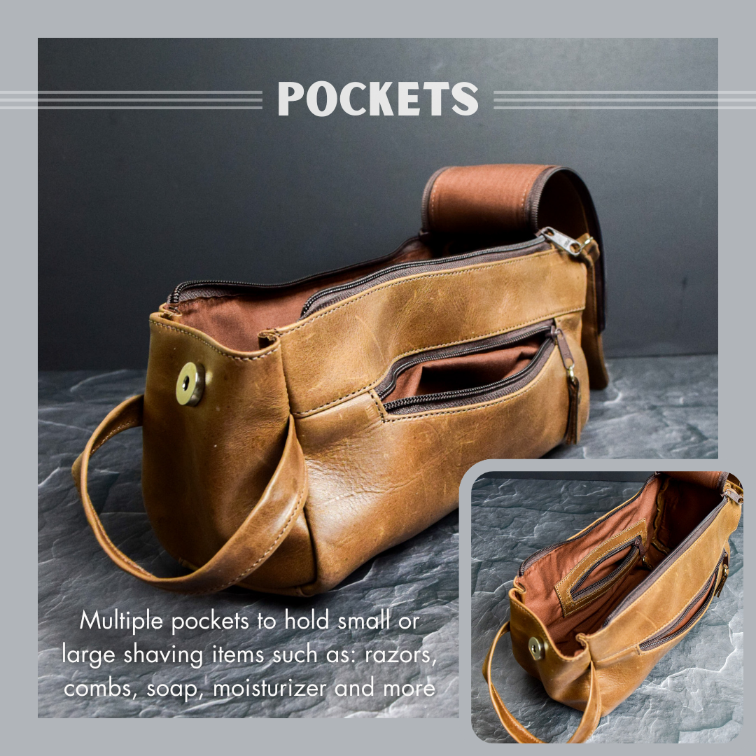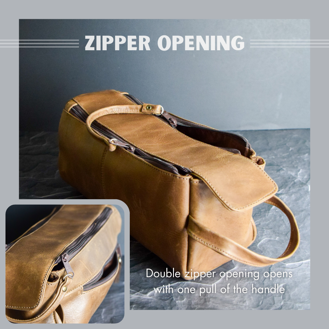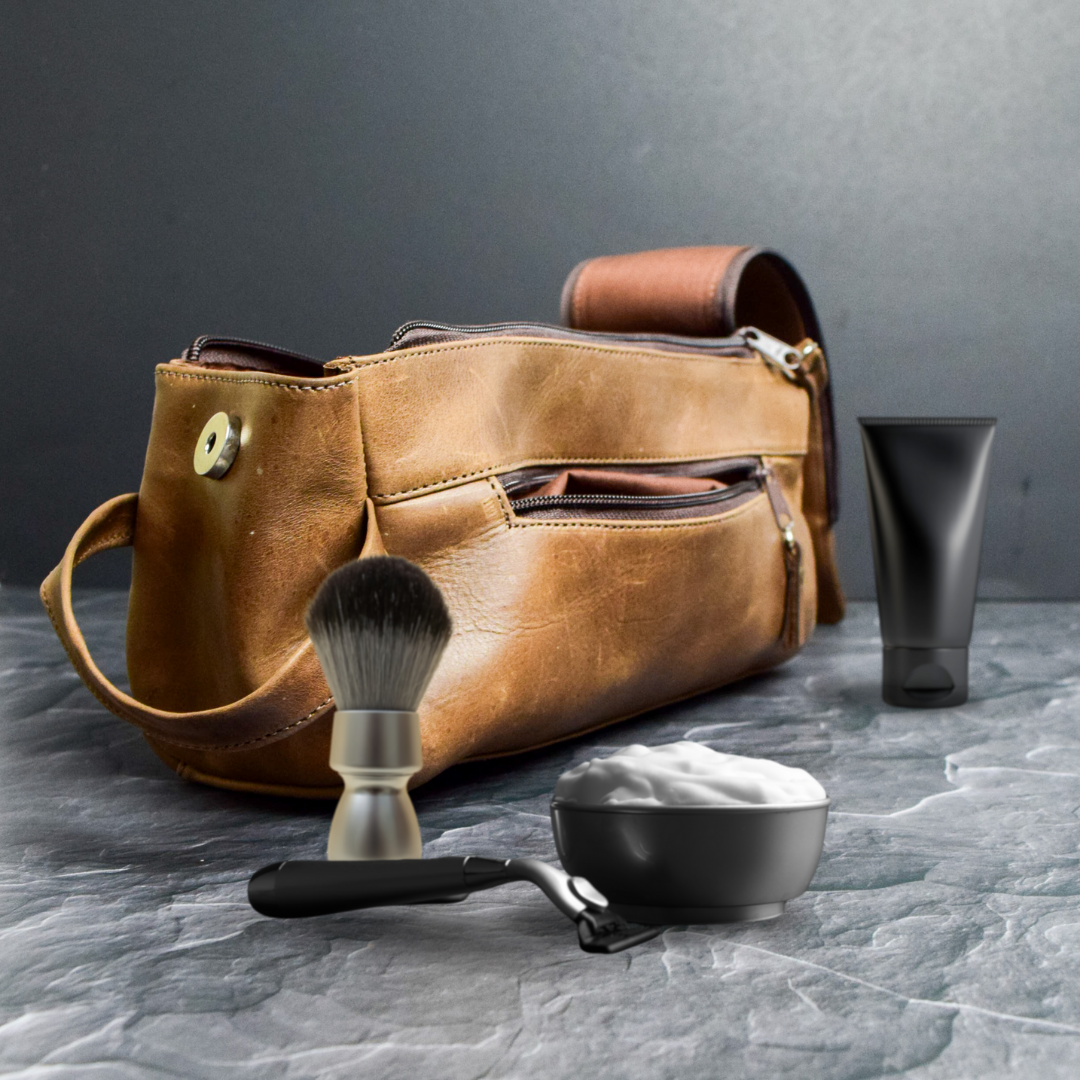 Men's Leather Toiletry Bag - Leather Dopp Kit for Travel - Grizzly Color Full Grain Cowhide Leather