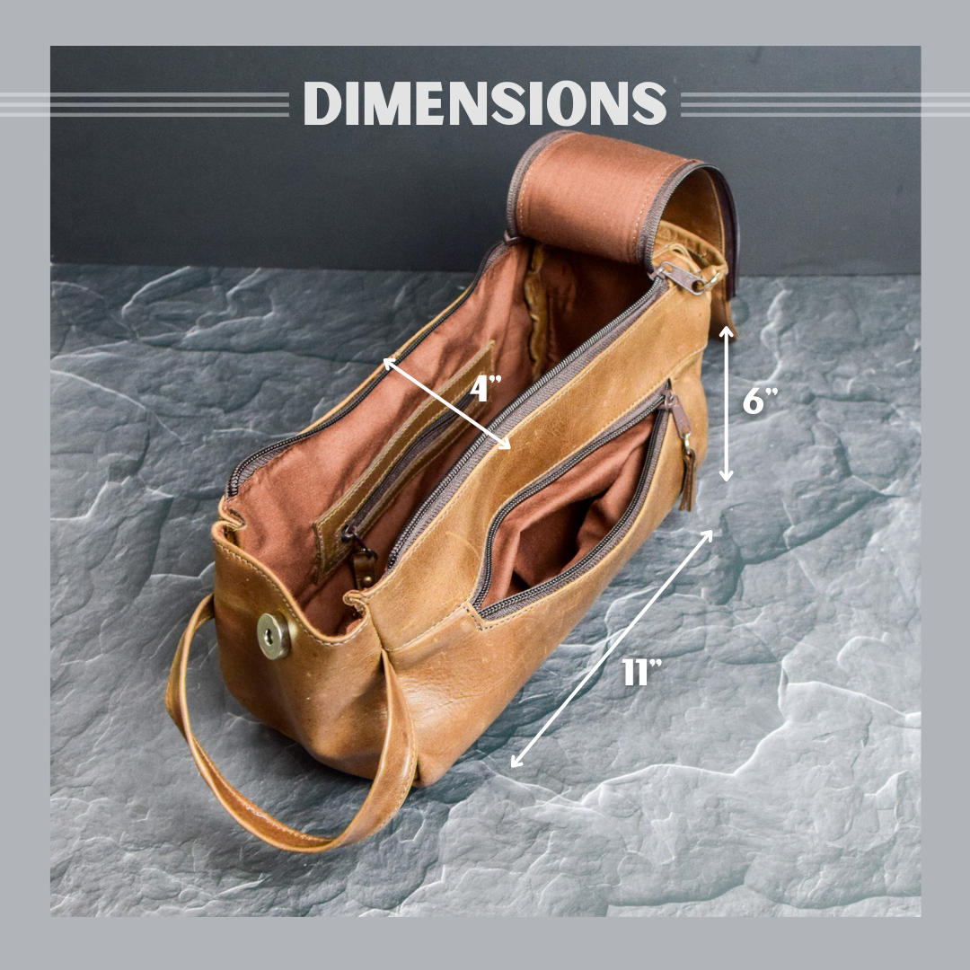 - It's the perfect size. This men's leather hygiene bag measures approximately 11 inches long, 6 inches tall, and 4 inches wide.