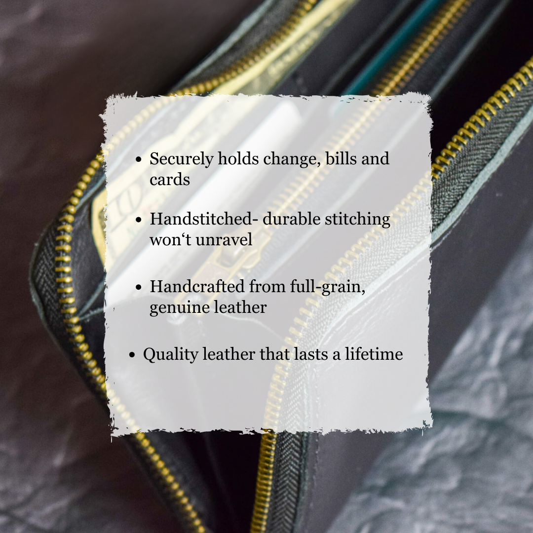 - The full zipper on the genuine leather zip around wallet makes it easy to access the contents while keeping them securely inside.